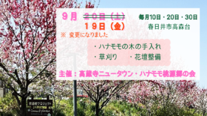 ハナモモの木の手入れ、草刈り、花壇整備 ●詳細 ●その他 ・高齢者福祉施設「どんぐりの森」駐車場9時集合です。 ・雨天中止です。 ●活動写真 ●主催・お問い合わせ 【主 催】 高蔵寺ニュータウン・ハナモモ桃源郷の会(ハナ […]
